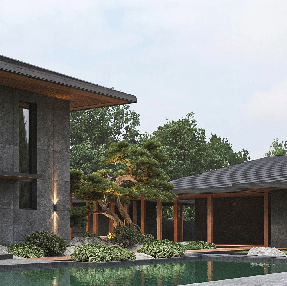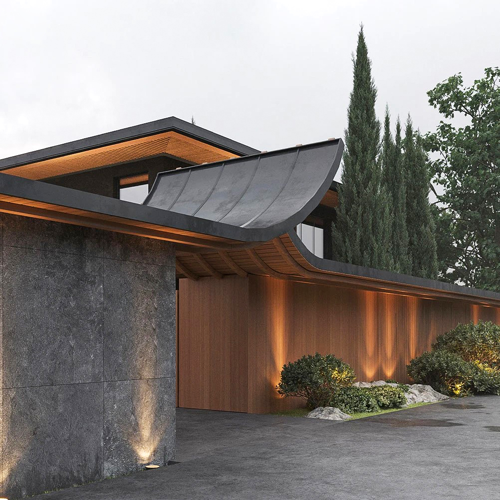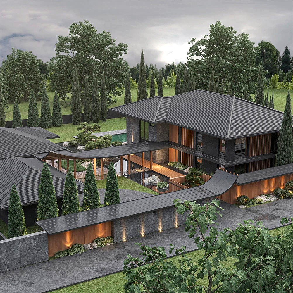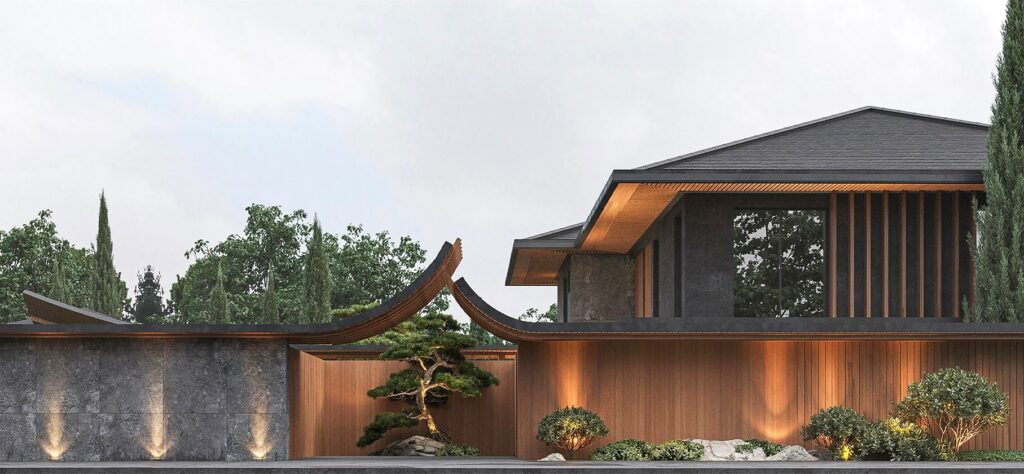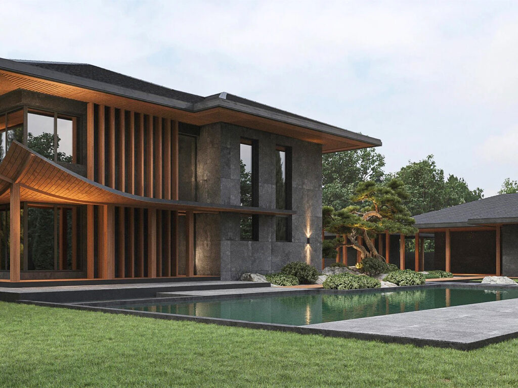 Разработать современный дизайна дома и ландшафтный дизайн прилегающей территории с элементами китайского стиля.