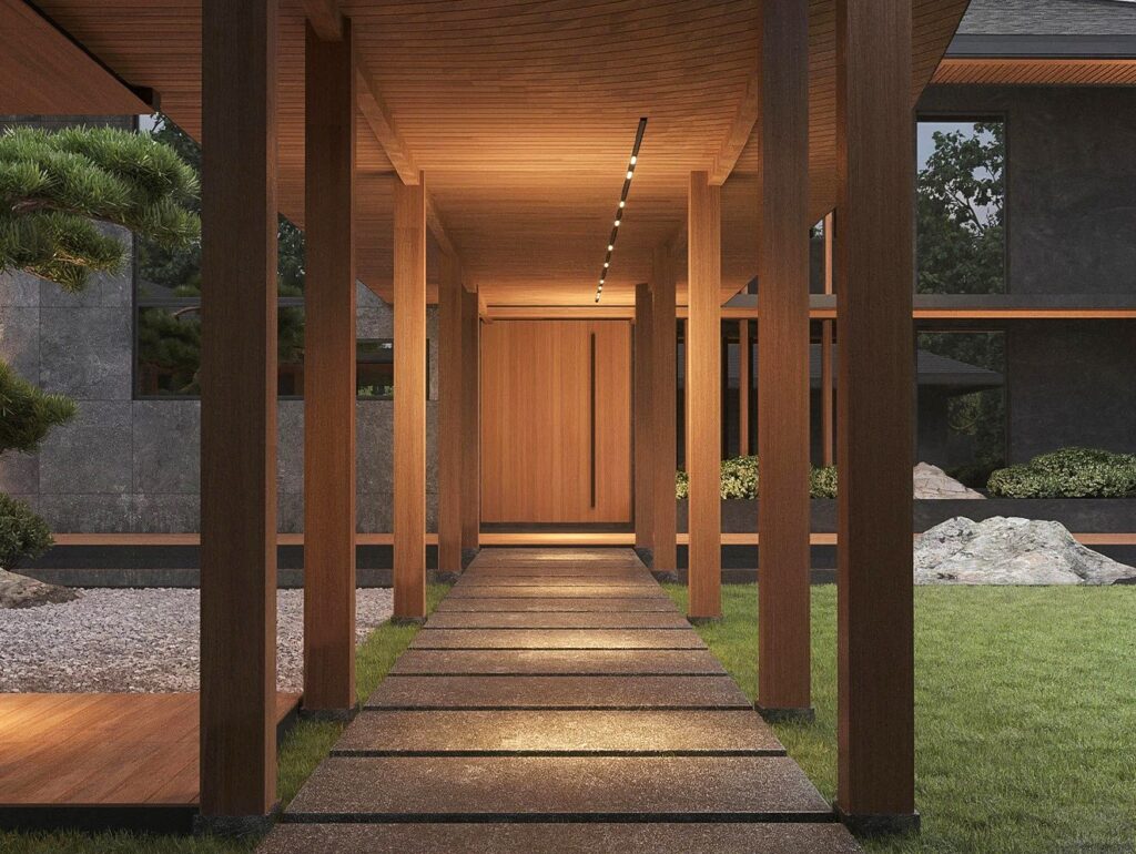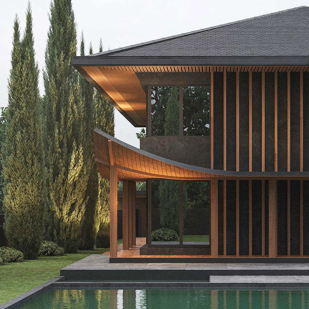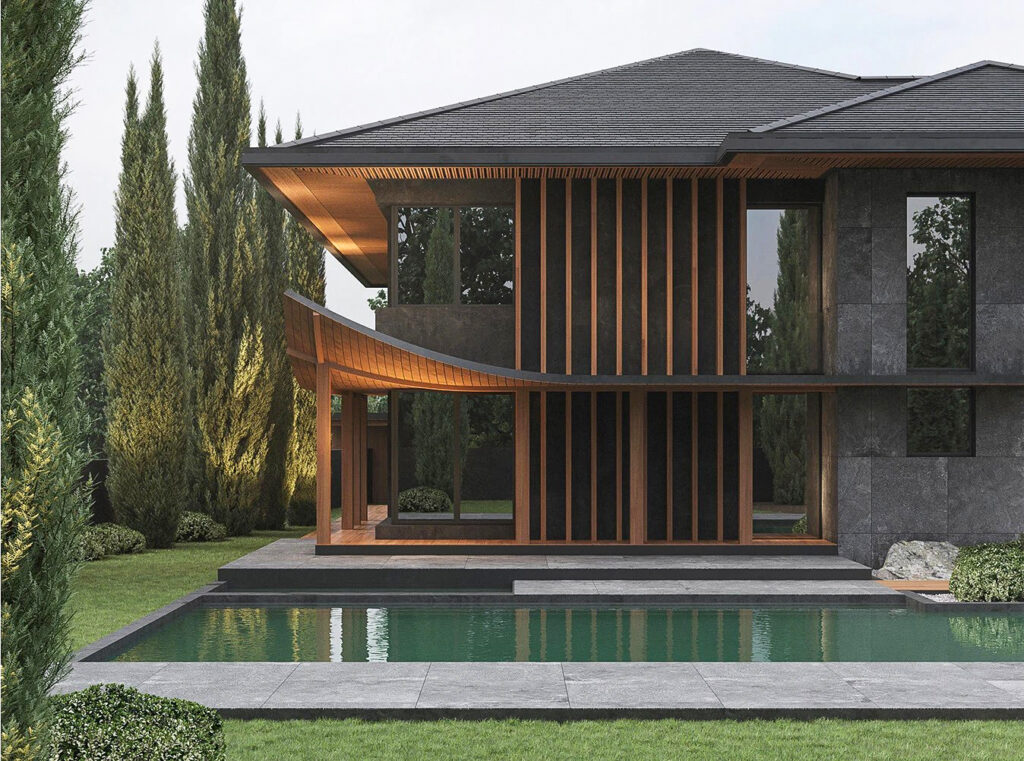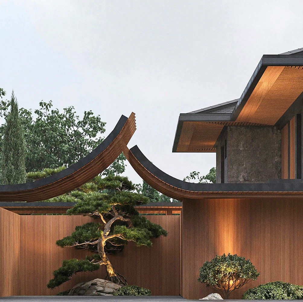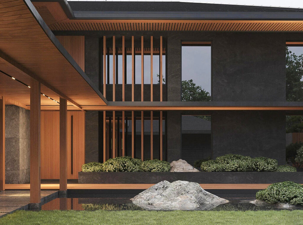 Разработать современный дизайна дома и ландшафтный дизайн прилегающей территории с элементами китайского стиля.