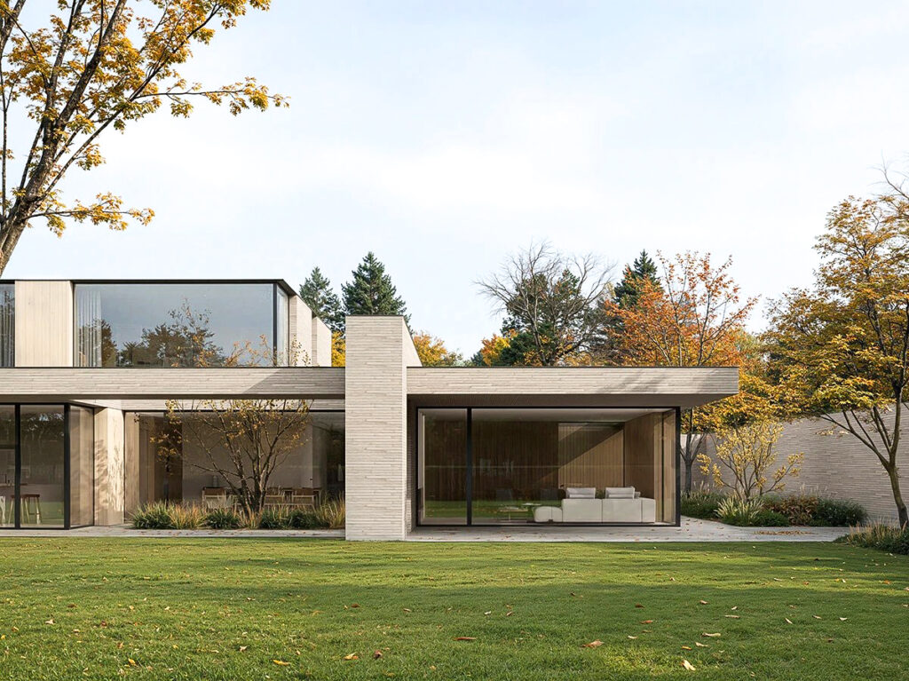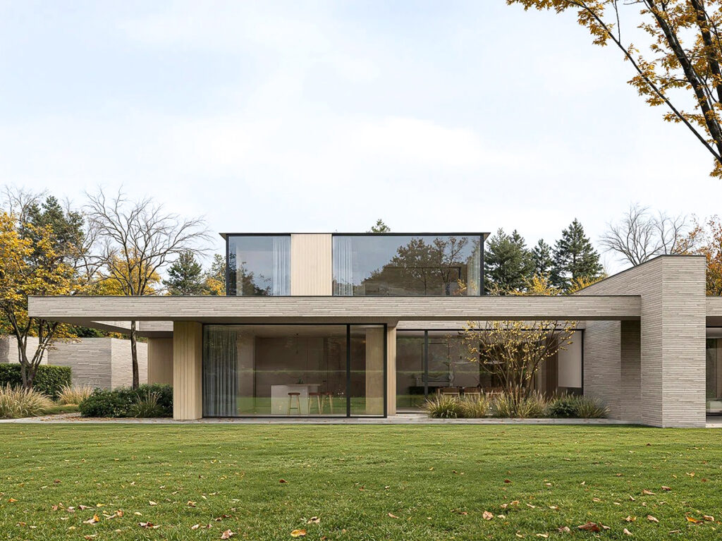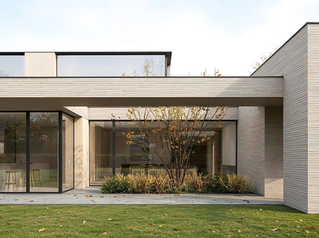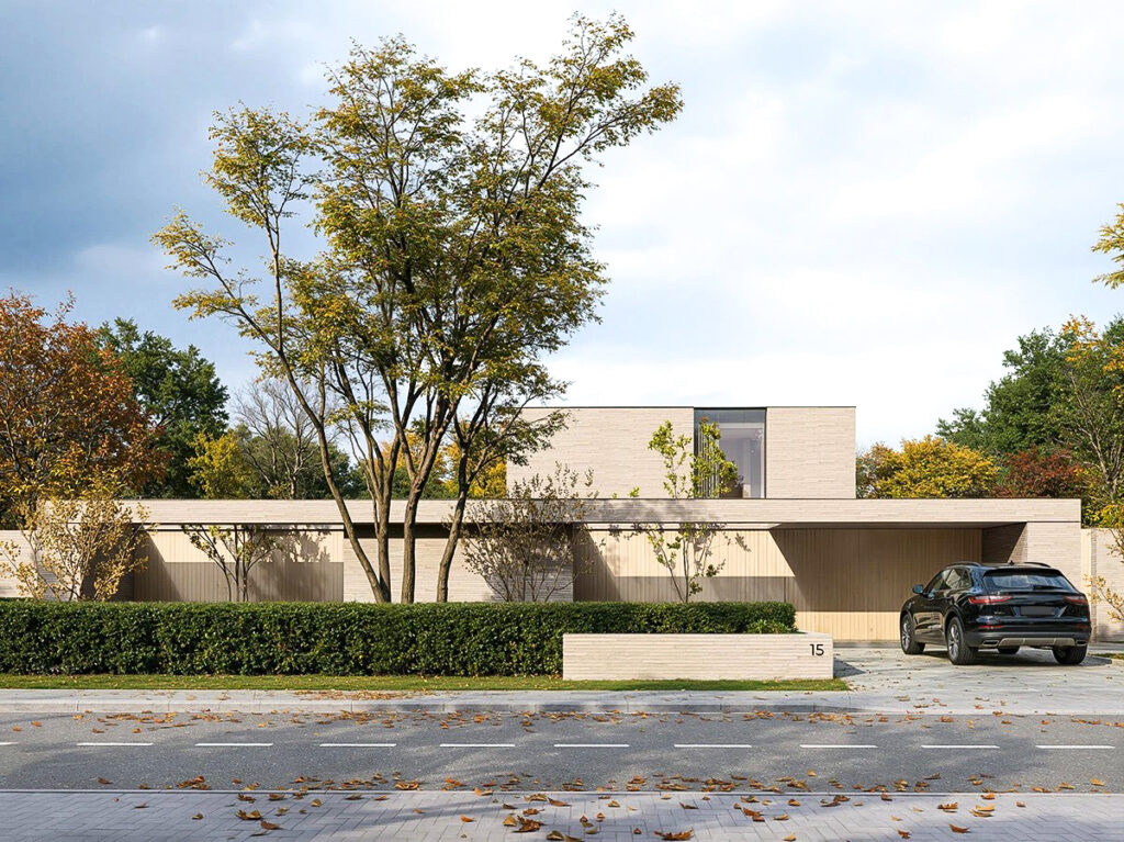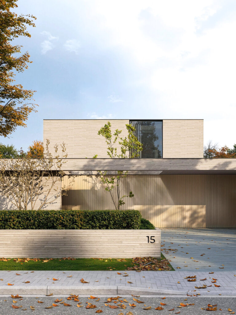 Это современная архитектура, выполняющая функцию защитного щита. Дом оберегает внутренний мир семьи от городского шума, подобно тому как раковина защищает самое ценное содержимое. Снаружи он представляет собой сдержанную, почти монолитную форму из кирпича длинного формата, излучающую надежность и недоступность. Однако внутри он раскрывает утонченную красоту и абсолютный комфорт. Это пространство, где безопасность сочетается с легкостью, а стены становятся не барьерами, а фильтрами между шумным миром и вашим личным покоем.